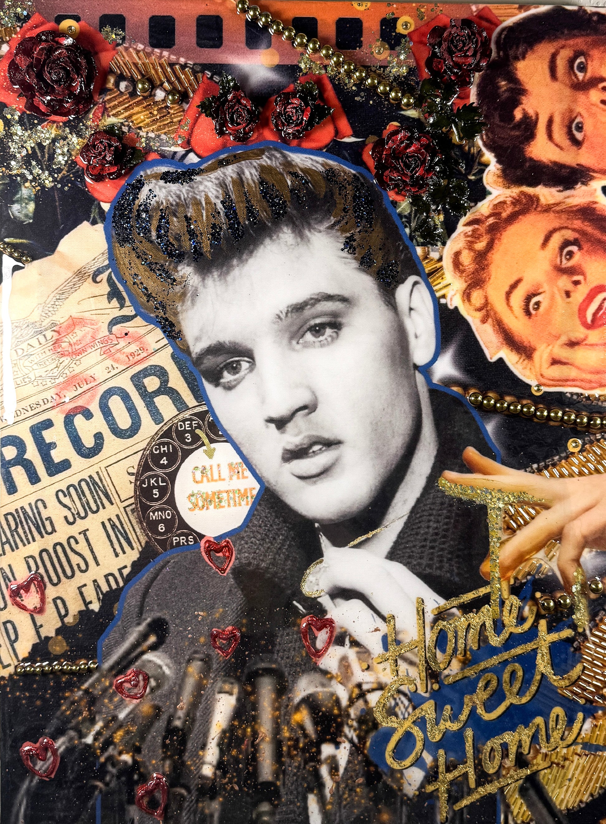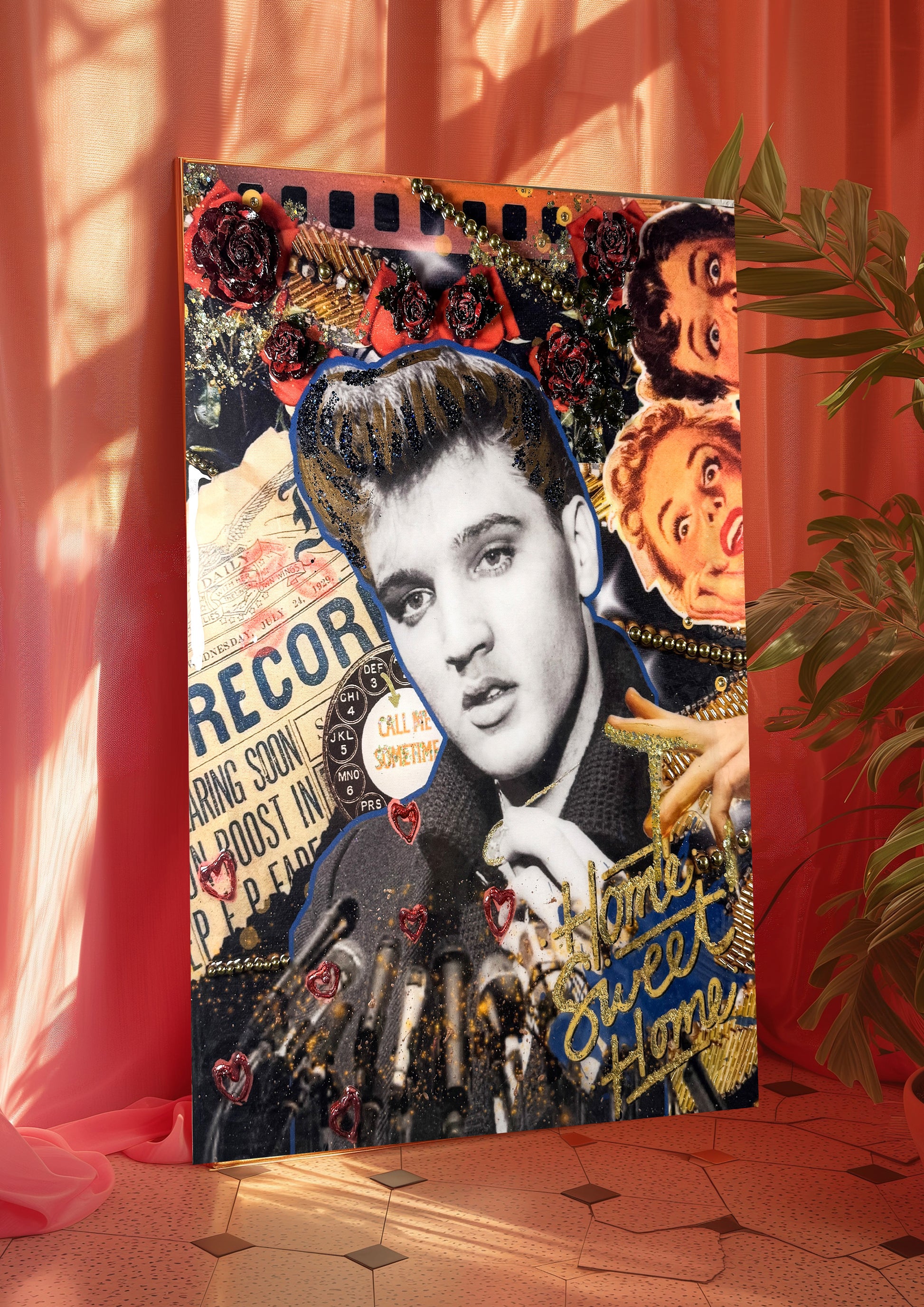 This original mixed-media resin artwork interprets Elvis Presley's return to Memphis following his service in the Army- a homecoming marked by reflection, humility, and transition. Stepping back into familiar streets and rhythms, the moment represents both an ending and a beginning. Through layered imagery, texture, and resin, the piece transforms this return into a meditation on identity, roots, and the pull of home after change.
