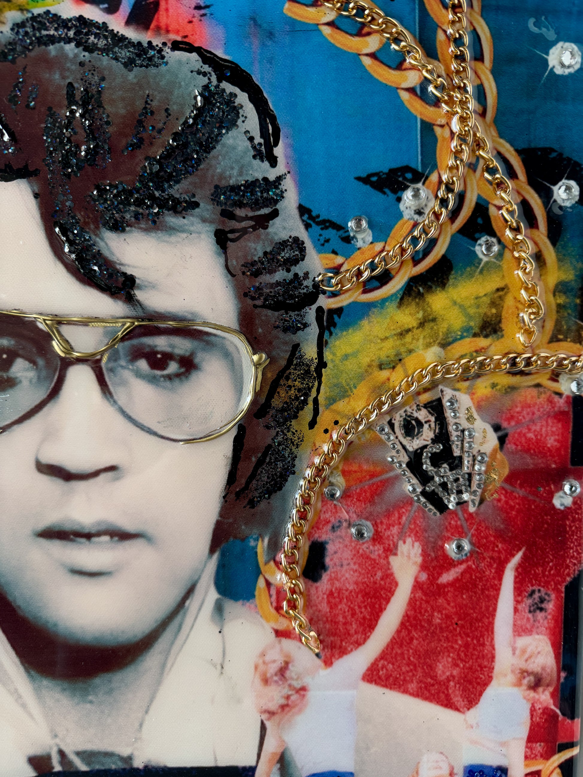 This original mixed-media resin piece portrays Elvis Presley in the early 1970's, a period defined by confidence, excess, and personal ritual. Known for his love of jewelry, cars, and symbols of authority. He carried a Maglite with him for a period of time given his fascination with law enforcement and his desire to embody responsibility and protection. This work reinterprets that moment through layered imagery and texture, offering a contemporary reflection on identity, power, and persona.