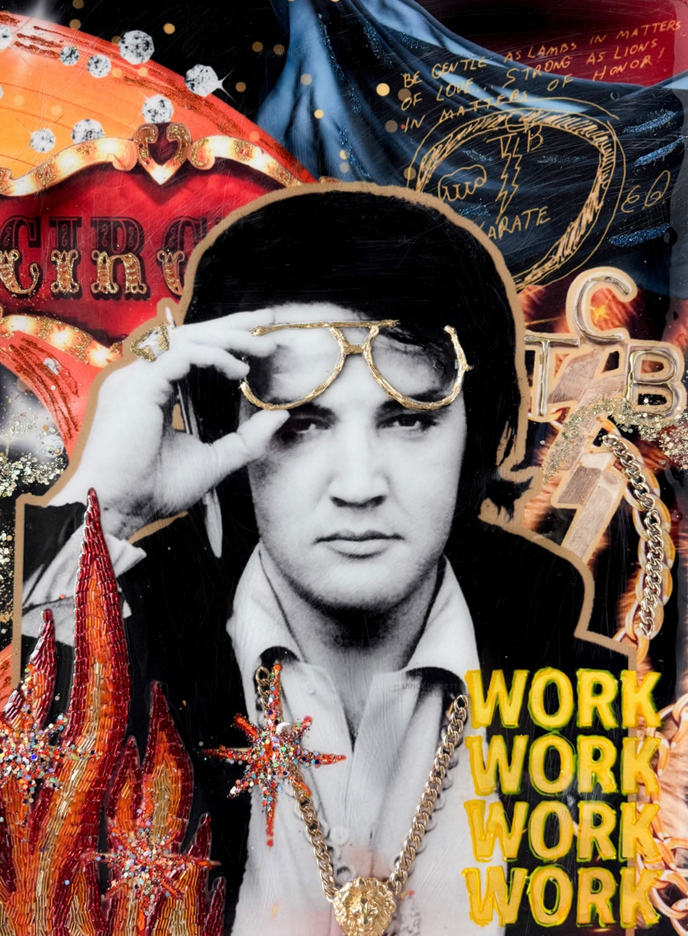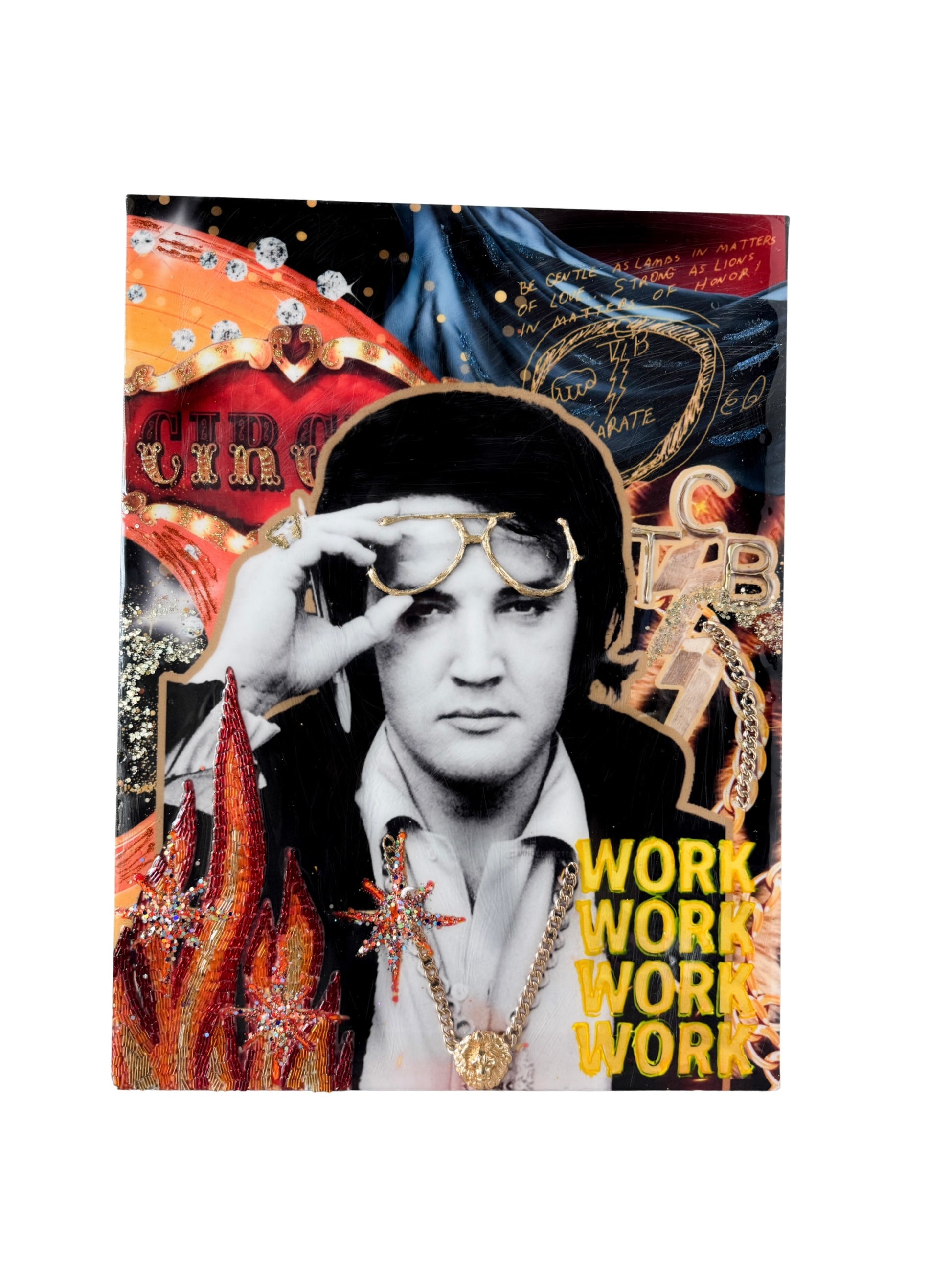This original mixed-media resin piece interprets Elvis Presley through the balance of relentless work ethic and a deeper search for purpose. Layered imagery and texture reflects the tension between discipline, ambition, and the quiet longing beneath the surface- transforming a familiar figure into a contemplative, contemporary work of art.
